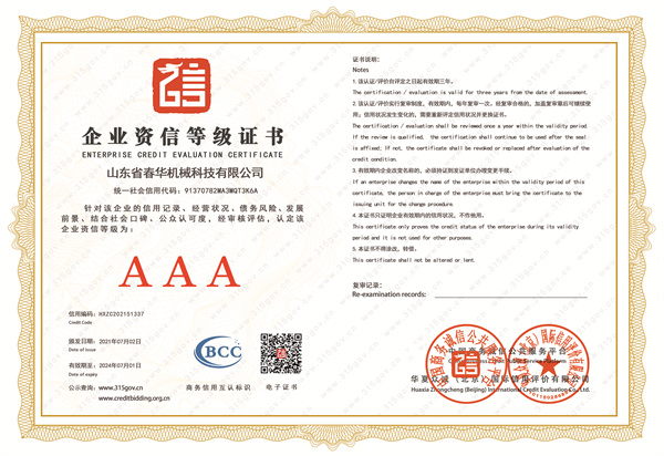 企業資信品級證書-企業聲譽-山東省春華機器科技無限公司-山東省春華機器科技無限公司
