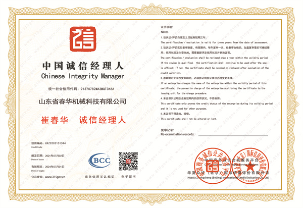 中國誠信司理人-企業聲譽-山東省春華機器科技無限公司-山東省春華機器科技無限公司